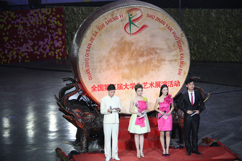 担任开幕式的四名主持人是组委会从各所高校中层层选拔出来的,他们清新自然的主持风格,令观众耳目一新。男主持陈正源同学是学院戏剧系影视表演专业的男生,外形挺拔帅气、笑容灿烂阳光,他在舞台上的从容自如给观众留下了深刻印象。