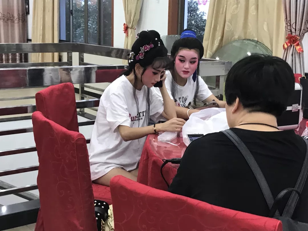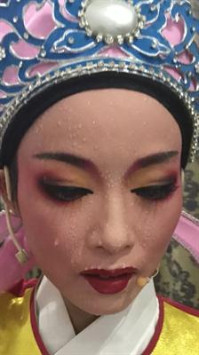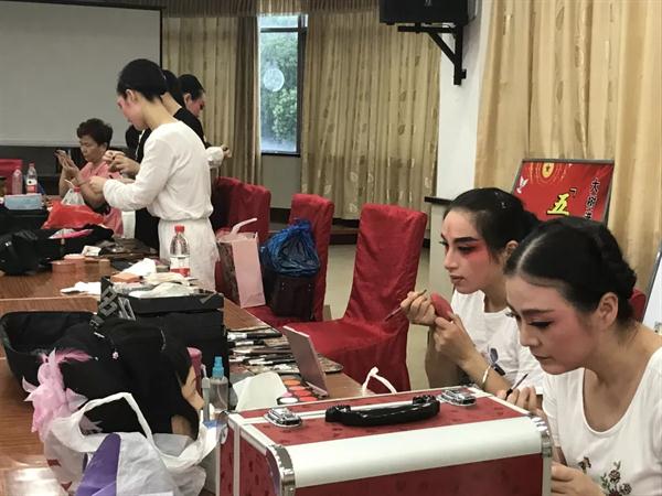 根据绍兴天气预报,7月27日,绍兴只有东北风1级 ,全天气温最高达37℃,傍晚33℃,日落时间18:56。也就是说,天空还留着太阳余晖,展演就开始了。在后台,绍兴市柯桥区柯桥鸿运艺术团两位演完越剧折子戏《孟丽君•探病》的演员,“皇莆少华”鼻尖上的汗一串串往下淌,戏份更重的“孟丽君”脸上直接就是“瀑布汗”,额头、眉梢、鼻尖、脸颊、嘴角……没有一处不冒汗珠。剧团工作人员急匆匆帮她换衣服,脱掉外衫,里面还有夹衣,脱掉夹衣,还有戏曲打底,上身还有半袖绑臂……一位民营剧团演员说,戏曲演员比较辛苦,尤其是夏天露天演出,尤其是武戏演员,动作大,戏服更厚,但因为热爱,就能坚持。这次参演的一些民营剧团主要演员,本来就是戏迷,学得深了多了,就上台演出了。