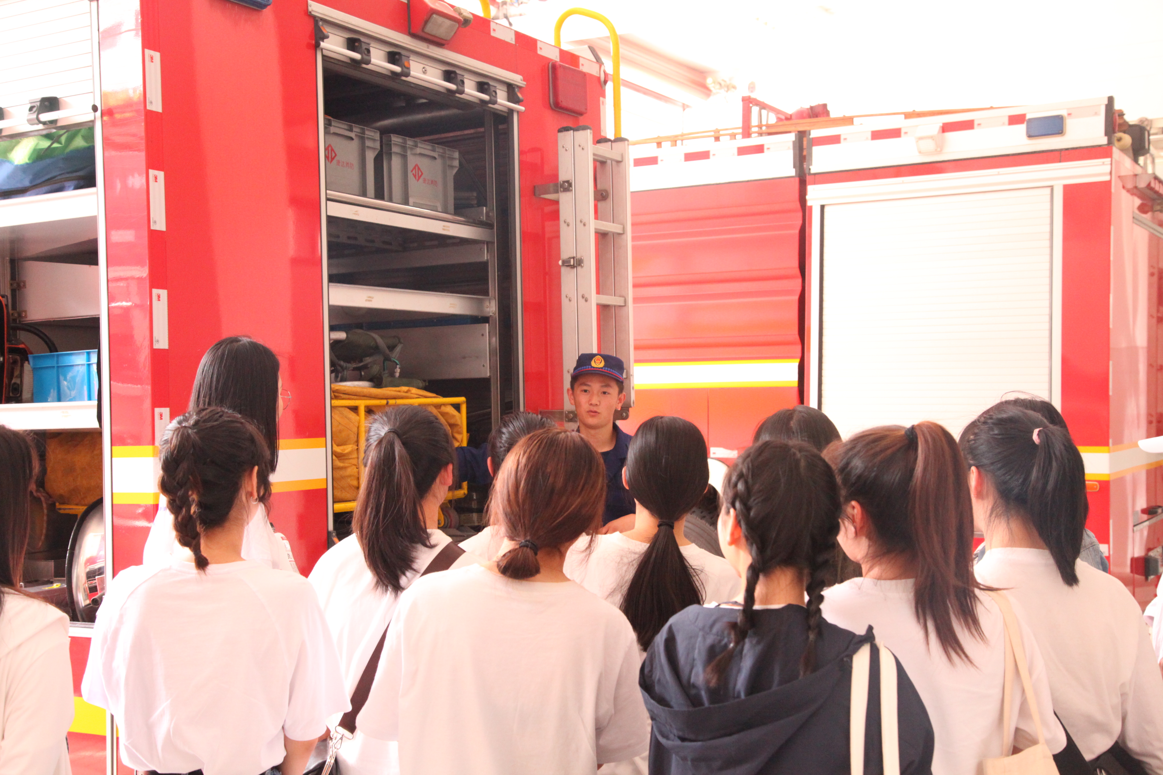 消防队员为音乐系小分队们详细介绍了各种应急消防车功能以及车内消防设备用途,让同学们试穿消防服,了消防制服的性能,体会战士们的使命与担当。