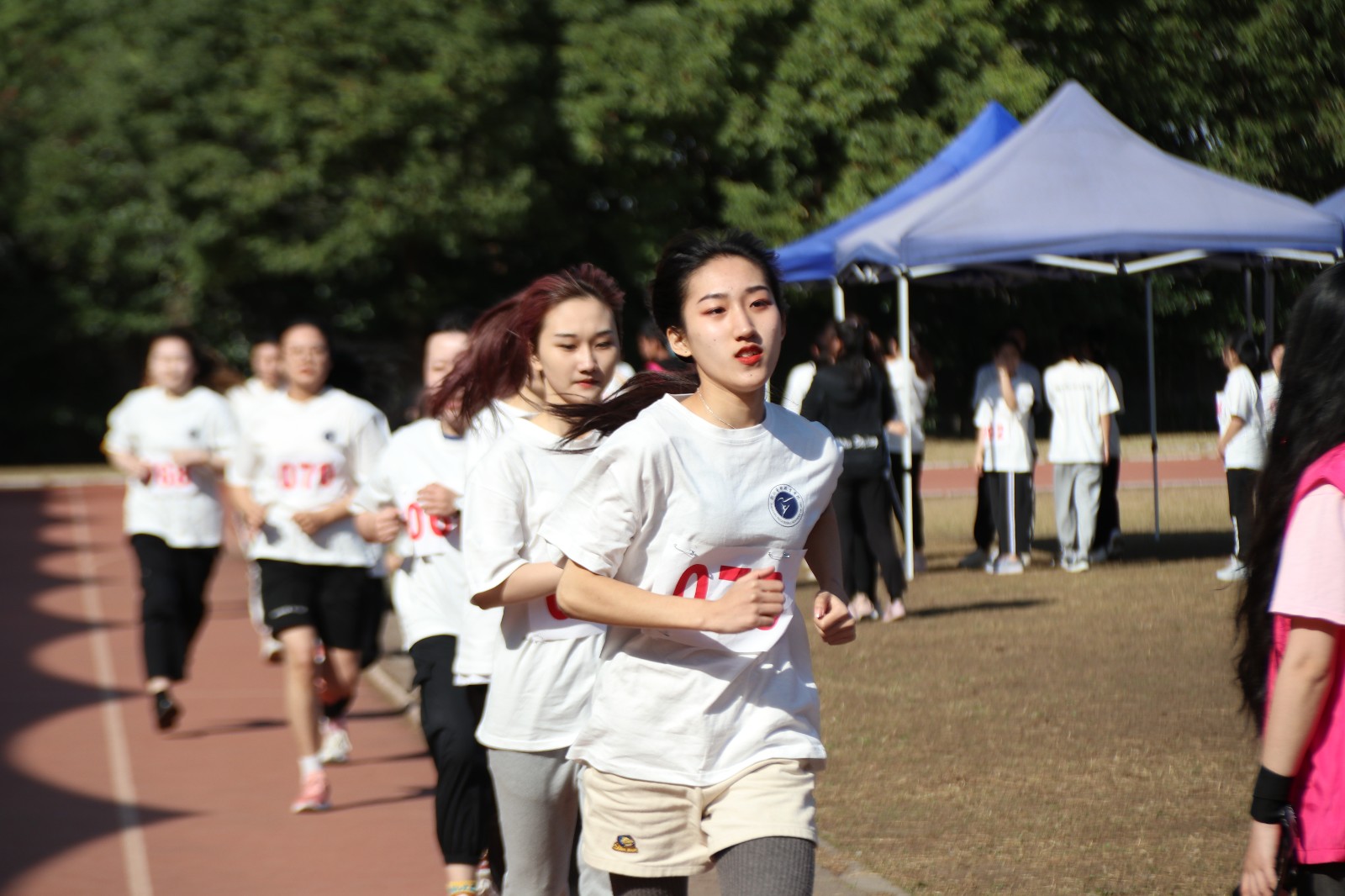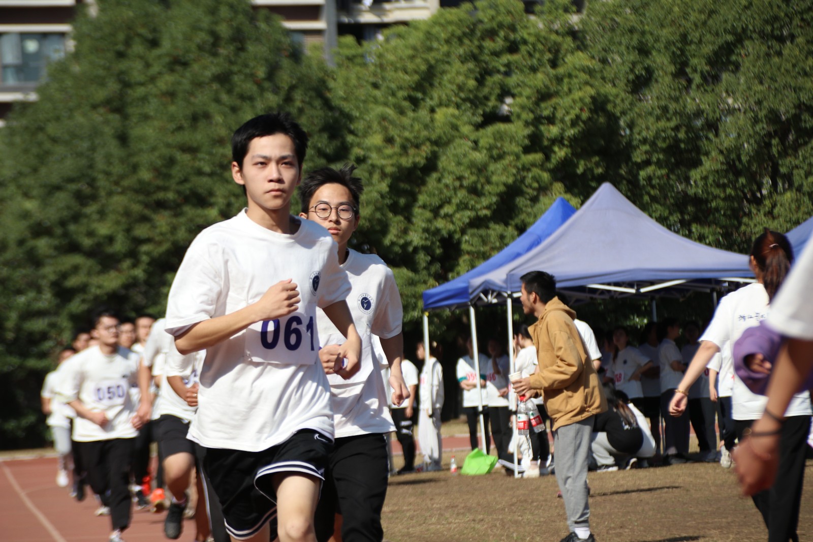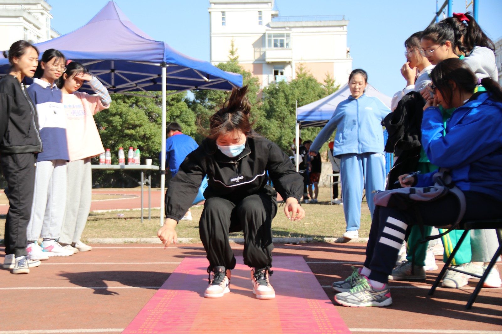 上午,老师和志愿者早早地到达场地,志愿者将号码布和白T恤分发给各位同学,整理好队伍后,体育老师带领所有同学做热身运动。在候场区等待测试的同学精神饱满、状态轻松,同学们按名单顺序分成16人一组,由志愿者带入测试场地进行各项测试。