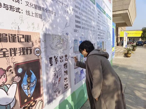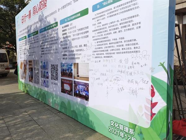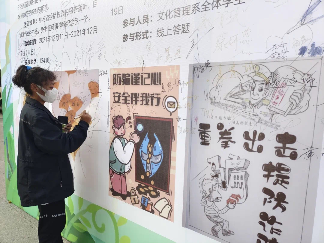 12月13日,同学们利用课间、午间时间,自发参加“日行一善 同心防疫”倡议签名活动,用郑重的签名表明抗疫决胜的信心。师生们纷纷驻足,文化管理系团学干部带头在“倡议签名墙”上郑重地签下自己的名字,并向大家发出“同心防疫”的倡议,号召大家在签名板上签名,展示出无比坚定的遏制疫情蔓延的决心。各系部同学积极响应,纷纷在签名板上签名,字迹飞扬,签下的不仅仅是一个名字,更是一份责任,一份担当。为了积极筹备“分享一本好书”云听书活动和迎新年云展播,同学们还纷纷担当起了网络才艺主播,准备了内涵丰富的好书推荐音频和精彩纷呈的才艺表演视频,为元旦当天的线上文化活动增色添彩,迎接即将共同在寝室欢度的元旦佳节。