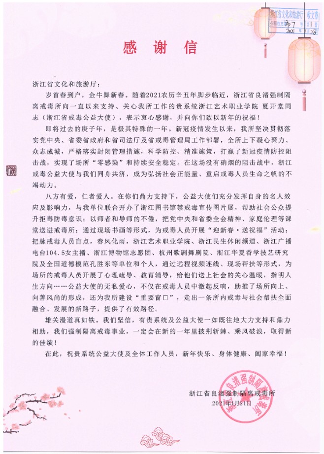 近日,浙江省良渚强制隔离戒毒所向浙江省文化和旅游厅发来感谢信,对我校党委副书记、浙江省戒毒公益大使夏开堂表示感谢。