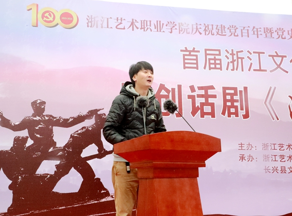 夏开堂作讲话,他代表学校,向参与话剧创作和演出的老师们、同学们致以问候,向中共长兴县委宣传部、长兴县文旅体局、长兴县文旅集团、长兴县煤山镇人民政府表示感谢。浙艺作为全国唯一一所入选“双高计划”的综合性高职艺术院校,话剧《清溪谣》的创作是戏曲表演专业建设群的一项成果。在全党上下正在开展党史学习教育之际,话剧《清溪谣》开排适逢其会,他要求浙艺师生们讲好中国共产党故事,创作和演绎展示党的伟大历程、伟大成就的优秀作品,为“文化浙江”“诗画浙江”建设提供有力人才支撑,在浙江“重要窗口”建设中发出浙艺声音、贡献浙艺智慧。