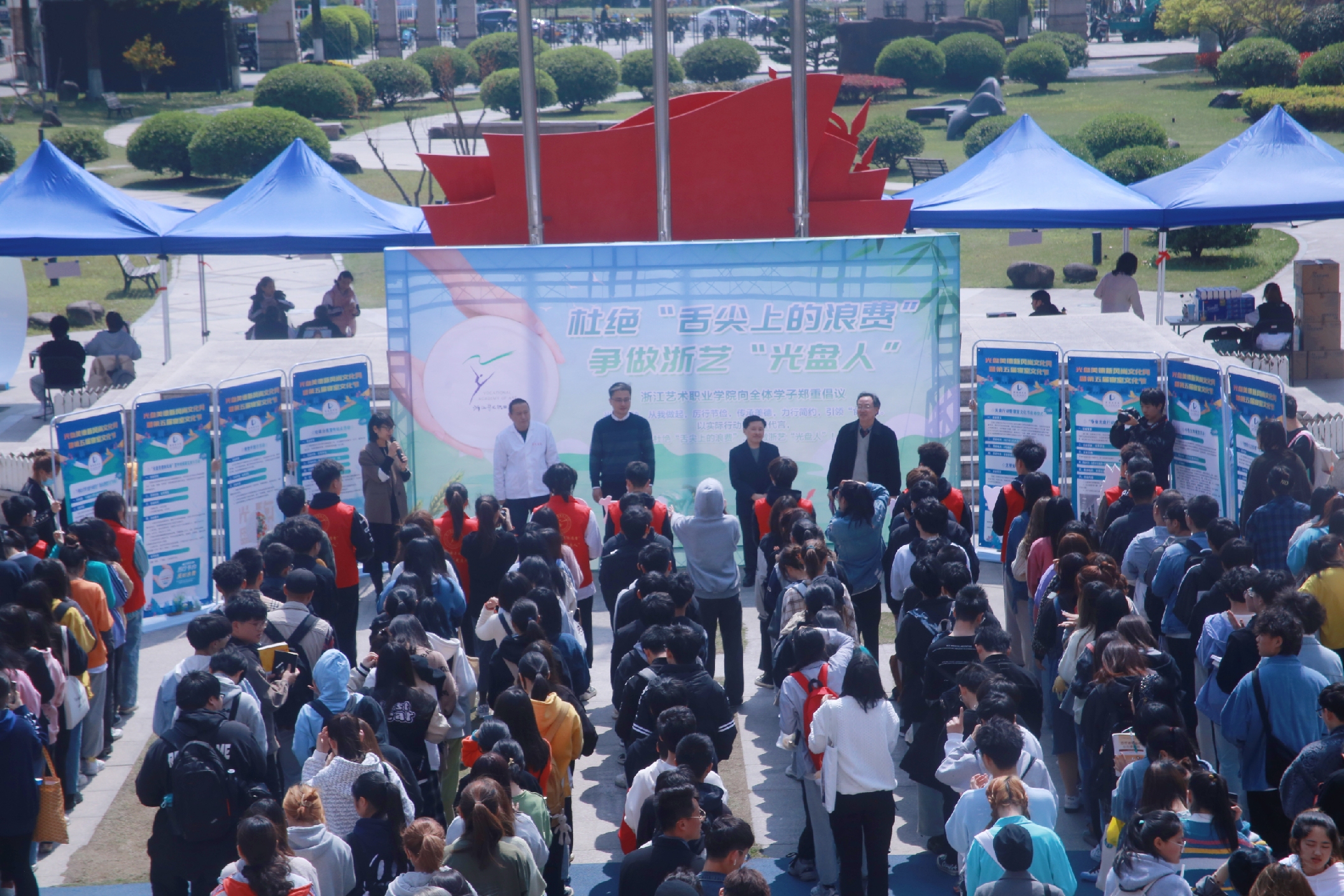 浙艺后勤服务有限公司食堂厨师长吕洪宣读“节约粮食,光盘行动”倡议书,倡导师生树立节约光荣、浪费可耻的思想意识,做光盘一族,珍惜粮食,拒绝浪费。彭云波带领影视技术系光盘行动宣传员代表共同承诺,将在光盘行动宣传期间,履职履责,为光盘建设、文明校园建设献出己力。所有影视学子一同在“争做浙艺‘光盘人’”的倡议板上签名承诺。现场举办趣味文明知识竞赛活动。