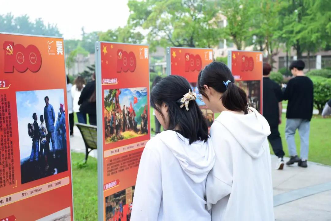 升旗仪式结束后,同学们观摩“美术经典作品中的党史”微展览。