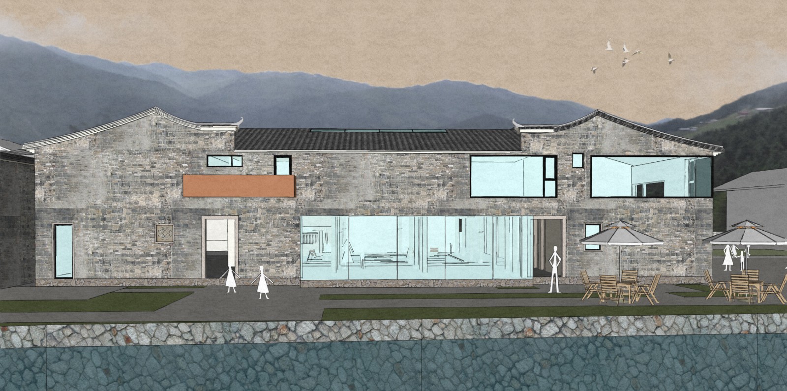 “为此,我们借用道家天人合一的思想观,来表现建筑与周围环境的融合关系。通过打破原有建筑的界面,引景入室。让天光水色,满盈室内,为游客带来天人合一的居住体验。”吉思凡说。