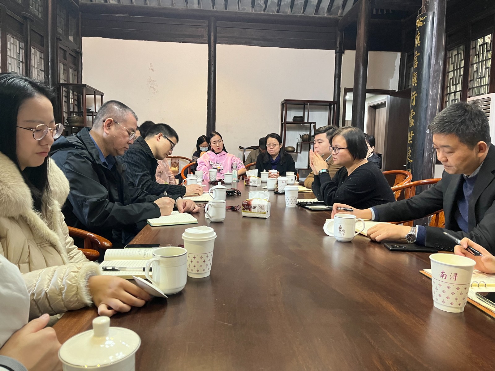 湖州南浔文旅发展集团有限公司总经理张丽莉、集团总经理助理褚夏亮、集团营销公司总陈宇衡、集团品宣部副部长卢淑娟与参与活动的全体教师进行了深入的座谈交流。张丽莉表示,南浔古镇距今已有七百多年的历史,是“江南六大古镇”中文化积淀最深、保存最完好的古镇。随着疫情的结束和古镇景区运营管理模式的调整,今年南浔古镇旅游人数将突破1000万人,首次实现年内破千万游客的目标。为提升南浔古镇内涵,丰富古镇旅游业态,近年来集团十分重视文旅融合的发展,此次能与音乐学院进行深度交流更是基于集团面向未来的发展决策上的一次探索,希望能实现音乐学院人才优势与南浔文化艺术发展潜力的完美结合,推动双方优势互补,共同发展。