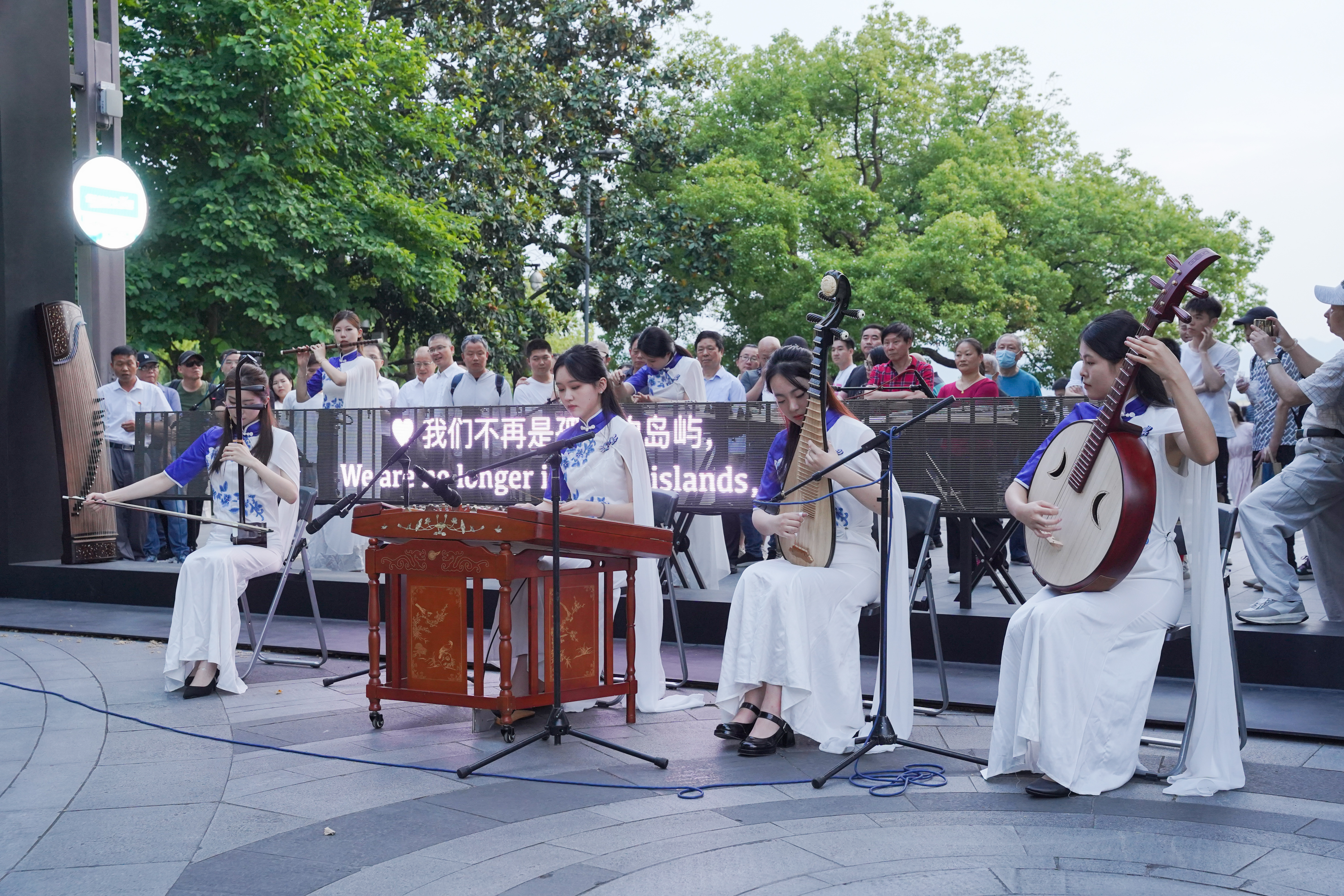 作为全国文化馆服务宣传周活动主会场的一大亮点,浙艺音乐学院“江南女乐”乐团的专场“文艺赋美”演出在西湖边精彩上演。乐团的女孩们穿着蓝白相间的礼服,身侧随风飘动的纱带如同西湖的涟漪,随着优美的音乐进入观众视野,为大家奉献了一场绝美浪漫的视听盛宴。